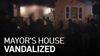 A group marched to San Jose Mayor Sam Liccardo's house Friday night, one of them spray-painting his front door with profanity.
